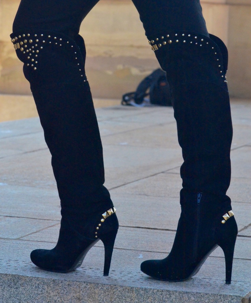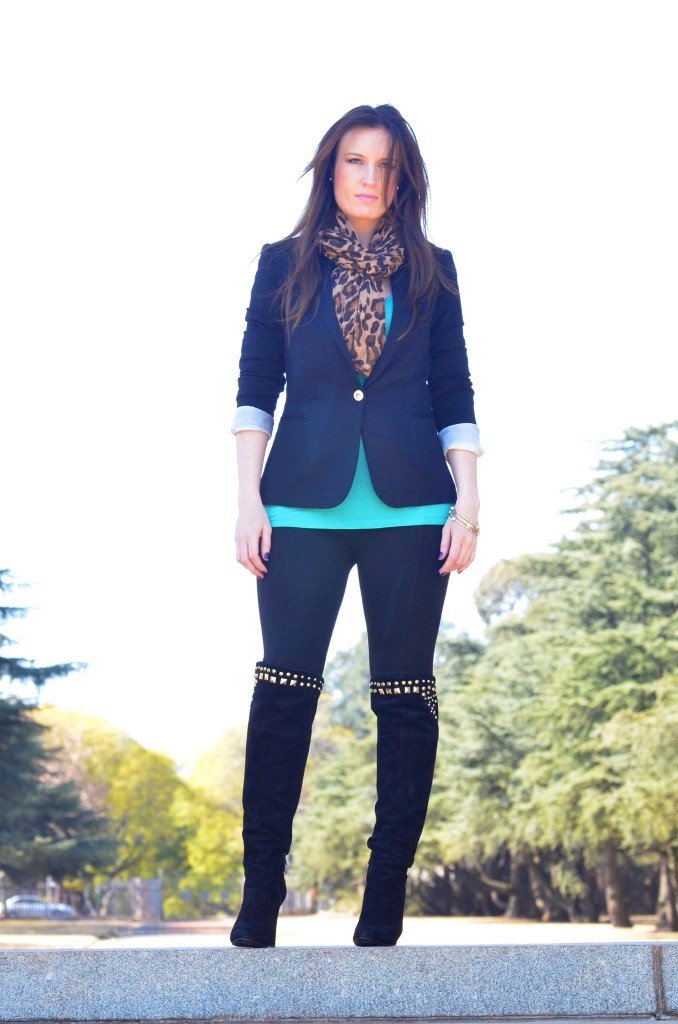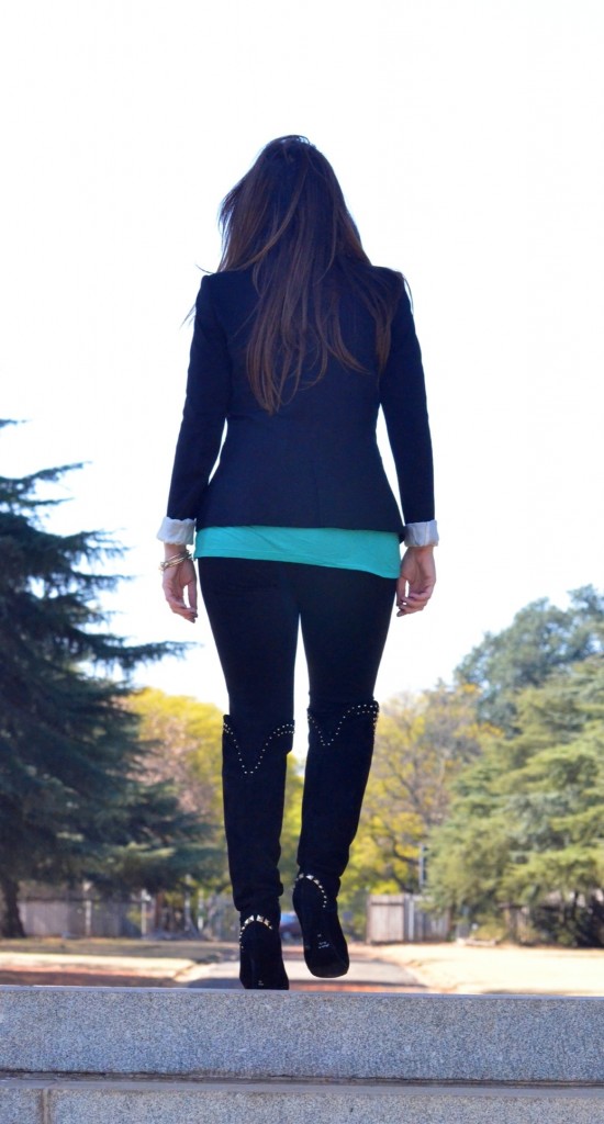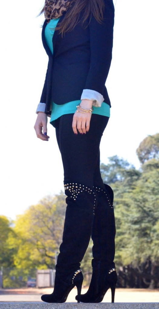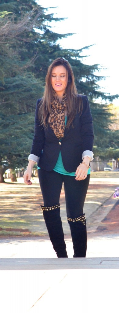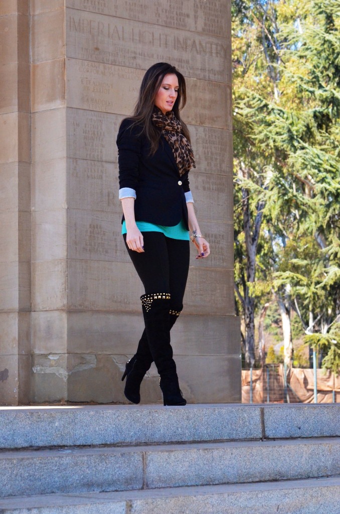 I used essential winter pieces like a blazer, some boots and a statement scarf. Blazers are the go-to staple in my wardrobe. They can be classy and smart in darker colours, fun and playful in bright, bold colours like emerald green, fuchsia and coral and sexy in lace! They instantly add a stylish element to just about any outfit and keep you warm! You can wear this timeless item with jeans, shorts, a dress, leggings, a skirt… the options are endless. Another staple in my wardrobe for winter are my knee-high suede studded boots. The gold studs add some interest to the boot, making it somewhat dressy. This gives me the option to either dress them up or down. Lastly, the statement scarf is a real life saver in the colder months. I tend to swap neck pieces for scarves in winter, for warmth reasons. Because scarves become my accessories, I like to make sure they are colourful and fun, to ensure that they take my outfit to the next level. I love scarves in leopard print (I own 6 in varying colours!), snake print, skull print and colourful tribal prints.