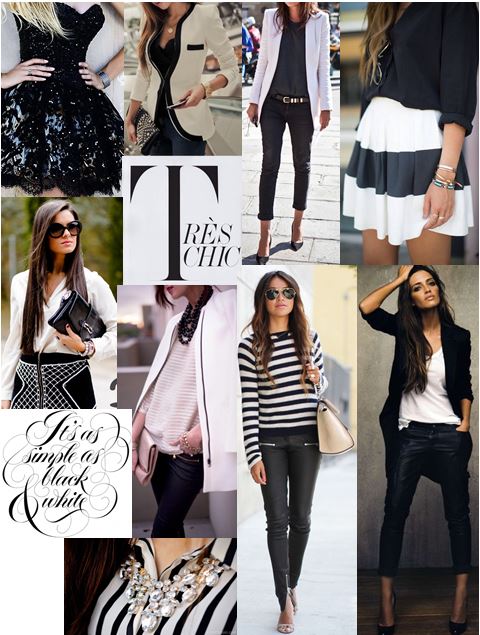 I love black and white. It’s my go-to colour combination. I love bright hues like fuchsia pink, pale emerald green and deep indigo, but there is something so striking and appealing about the simple combination of two colours that are absolute opposites. Technically speaking, white isn’t even a colour. It is the absence of colour. Black is what you get when you mix red, blue and yellow together. Anyway, all I know is that black and white are très chic and that I love wearing them together. Be careful of wearing plain black pants and a plain white shirt, otherwise you could end up looking like a waiter. Be sure to incorporate either a print or interesting texture (like leather-looking fabric for pants or sequins on a jacket or dress) and finish off with accessories. These are some looks I love…