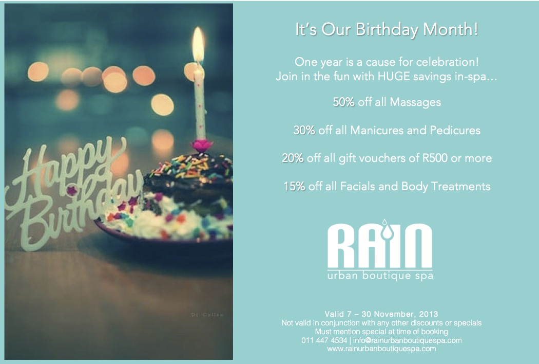 De-stress your body and bank account by treating yourself to a relaxing massage, facial or mani/pedi at Rain for the month of November. Because it’s their birthday month, Rain are offering spa treatments at a reduced price. The offer is valid until 30 November 2013 and when you call to book, be sure to mention the Birthday Special.