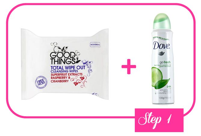Step 1: Refresh No time for a shower? Freshen up with a face wipe, and a blast of deodorant. Good Things cleansing wipes are free from nasties like mineral oils, parabens and Sodium Lauryl Sulfate and they’re also biodegradable so unlike most wipes, won’t add to landfill problems. You can find them at Clicks for around R35 for a pack of 25.