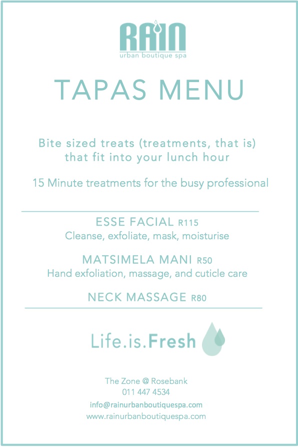 Last week I experienced a bite-sized dose of heaven in the form of a super speedy spa treatment. Normally you wouldn’t associate “super speedy” with spa treatments but what if your shoulders are aching after too many hours at your desk and you only have a lunch hour? What if you are going on a date and you urgently need a wax and a pedi? Rain Urban Boutique Spa is the answer to all of these dilemmas! Situated in Rosebank Mall, it is literally a haven where you can relax and get date/afternoon/party ready in a flash. Rain offers ‘Tapas’ Treatments, which are 15 minutes each, and which allow you to get your poor nails/aching back/hairy legs seen to. Imagine having a quick back & neck massage, mani and facial in only 45 minutes! That’s express beauty at its best.